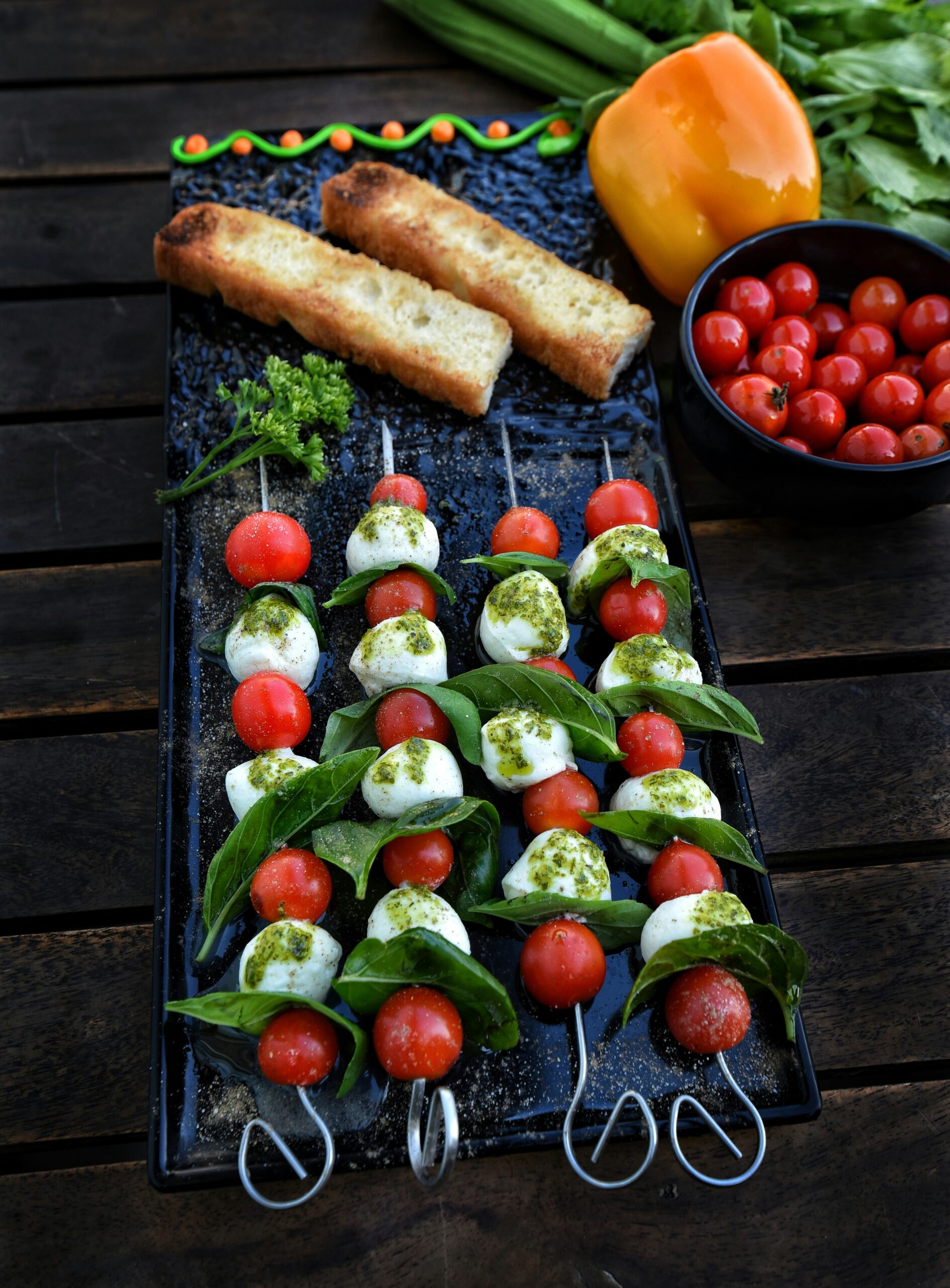 Once all skewers are filled and assembled, brush the olive oil mixture over the top, followed by the balsamic glaze over all the skewers. Plate and serve.